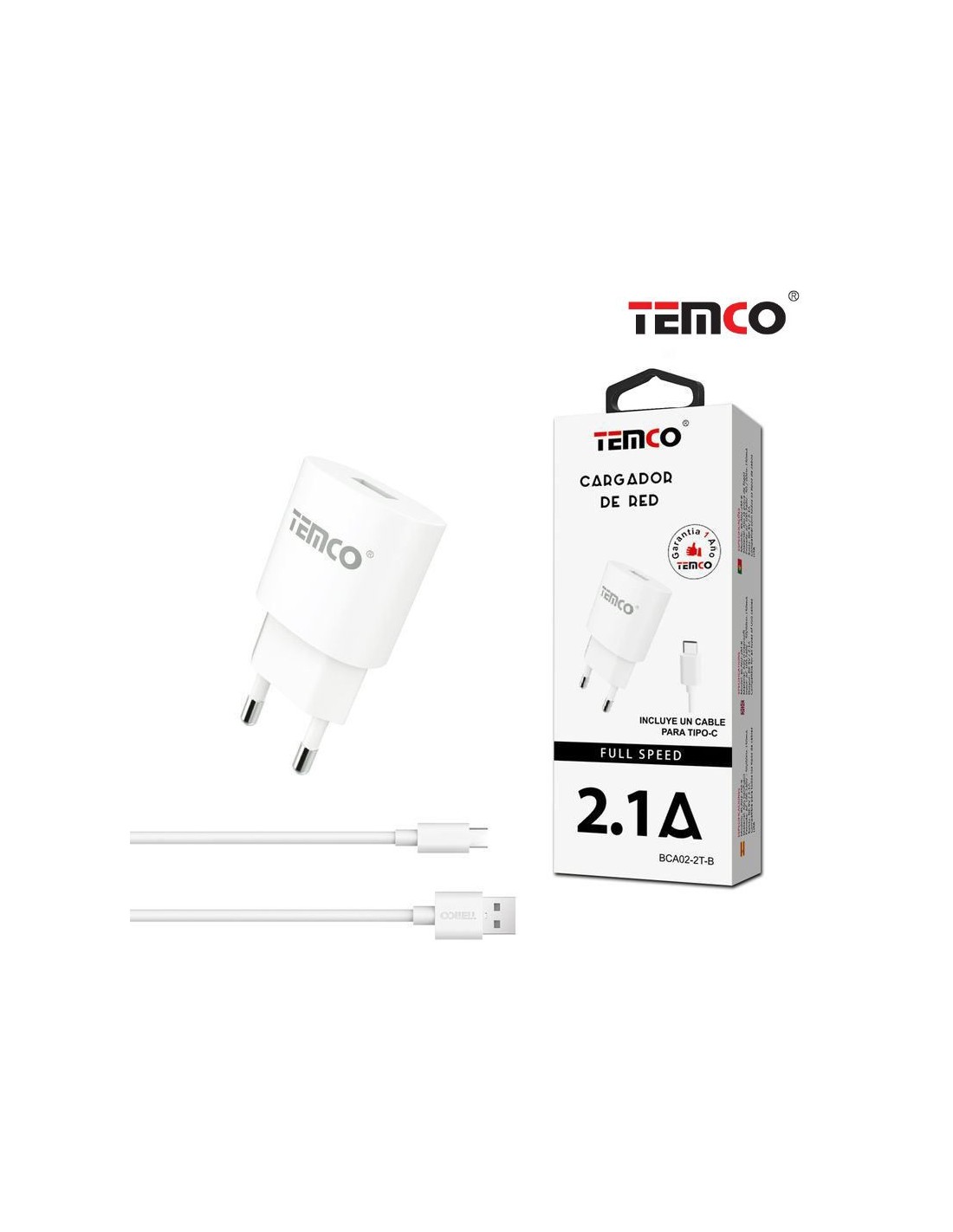 Cargador de Pared USB / MicroUSB 2.1A Temco BCA02-2M-B